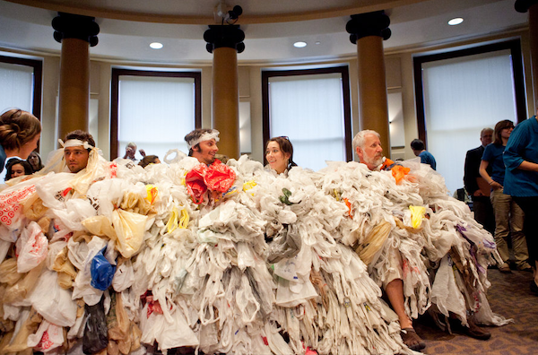 Jacque, second from right, sits front row as a plastic bag monster at Portland City Hall during a hearing to pass what would become first single-use plastic bag ban in Oregon.