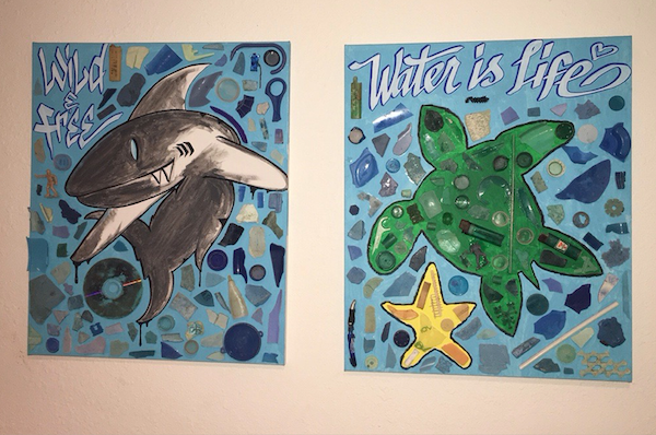 A couple of Jacque and co-conspirator Kable Roc's comic-themed plastic debris mosaics made from cleanup debris.