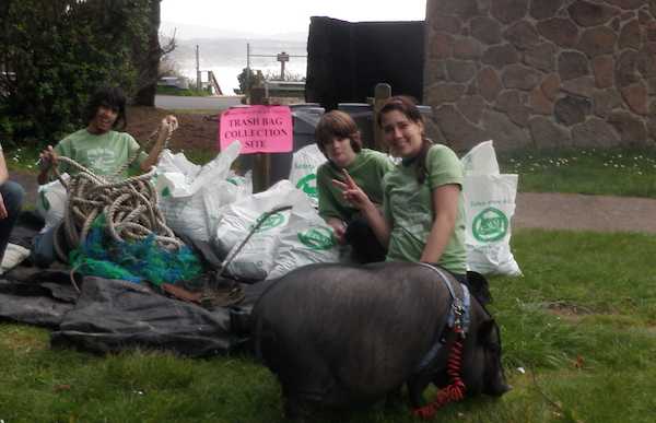 Jacque, far right, at her very first cleanup in 2010 where her pot-bellied pig made a special appearance
