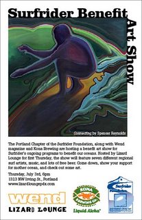 The Portland Chapter of Surfrider Foundation, along with Wend magazine and Kona Brewing are hosting a benefit art show for Surfrider's ongoing programs to benefit our oceans. Hosted by Lizard Lounge for first Thursday, the show will feature seven different regional surf artists, music, and lots of free beer. (Spencer Reynolds 'Connecting' pictured right). Plus, a Surfrider table with info on our campaigns, programs, and volunteer opportunities! Come down, show your support for mother ocean, and check out some art. Thursday, July 3rd, 6pm 1323 NW Irving St., Portland http://www.lizardloungepdx.com/.