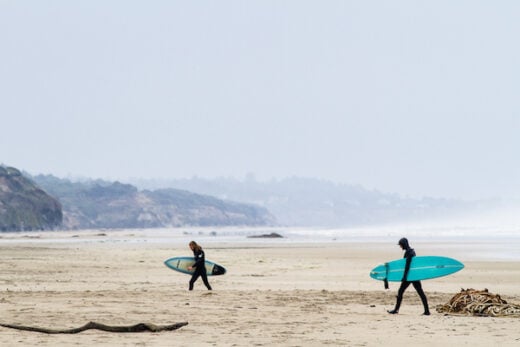 Author Charlie Plybon and partner Cristen following a surf along an undisclosed stretch of Oregon coast.