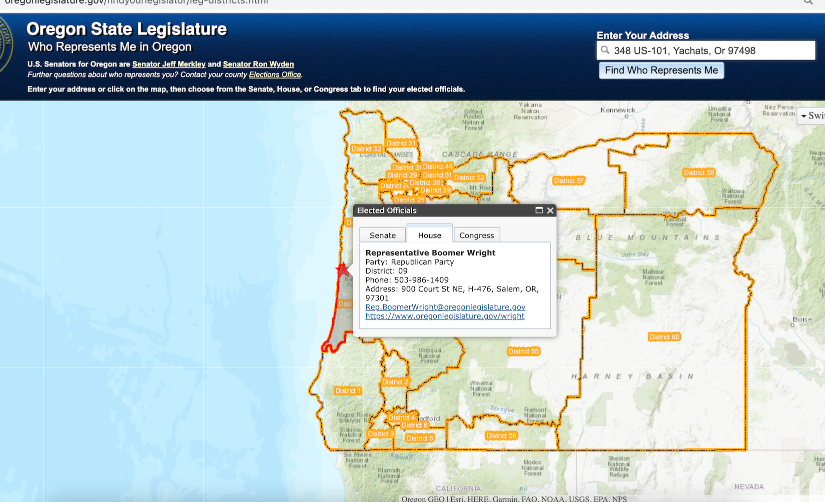 Go to the Find Your Legislator page and enter your physical address (not PO Box). The map will zoom into your district and you can click on the different tabs in the pop-up box to see your State Senator, Representative, and Federal Congressperson. You will find their contact information and a link to their webpage.