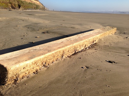 The research is the work of Karla Robison (Manager of Environmental & Emergency Services, Ucluelet) and Stephen Holland, who have assembled a detailed picture of the size (to millimeter dimensions), shape, construction, milling, and joinery of these distinctive pieces of wood. Just last week on my beach walk from Thiel Creek to Lost Creek, I saw over 67 pieces of this type of lumber, in just a half mile walk.
