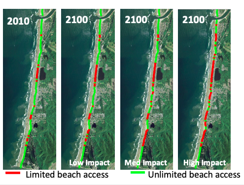 Pending how we respond to coastal erosion can have big impacts on beach accessibility. The above models a stretch of Oregon beach's accessibility under various shoreline protection responses.