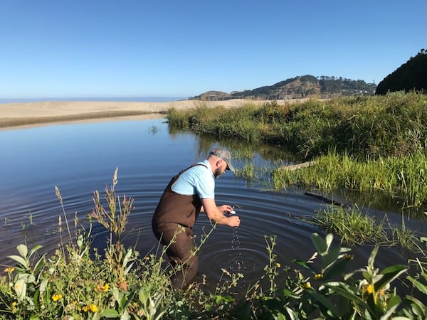 Graduate student Brian Schlottmann collects water quality samples from Big Creek outfall at Agate Beach in Newport, OR