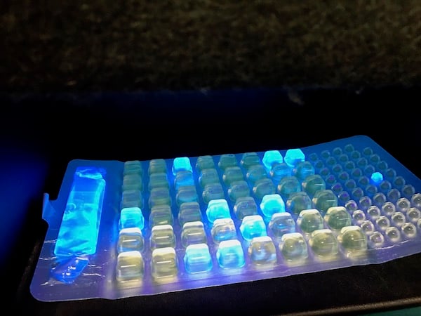 Our traditional method reveals results through use of a UV lamp and fluorescing wells that correspond to "positive" bacteria colonies