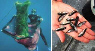 A snorkler recovers a SMURF unit at left, which creates surface area for juvenile fishes (right) using the marine reserve to be captured and recorded