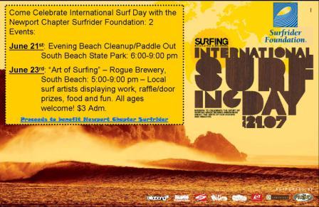 Come out and celebrate International Surf Day with the Newport and Portland Chapters of Surfrider Foundation. Three Oregon events are lined up and sure to be a lot of fun and a great benefit for our oceans and surfing. The first event takes place on the actual "international surf day", June 21st. An evening beach cleanup and paddle out will occur at South Beach State Park from 6:00-9:00 on Thursday June 21, 2007. Also on Thursday, is the Todd Hannigan concert at the Aladdin Theater (see http://www.surfrider.org/portland/index.html for details). The blow-out event is on June 23rd at the Rogue Brewery in South Beach from 5:00-9:00: "Art of Surfing", featuring surf/skate photography and art from around Oregon, food, drinks, raffle and door prizes, all ages welcome: $3 admission. Proceeds from this benefit will be split between the Newport and Portland Chapter to fund water quality, beach preservation, beach access, and special places campaigns. Come on out to have fun and learn how Surfrider is working for you!