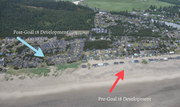 Many homes like these along the ocean shore in Oregon were developed prior to Statewide Planning Goal 18, and the management challenges they face today really underscore the importance of that planning goal in guiding responsible development along the ocean shore. Many developments prior to the guidance of Goal 18 also have property lines that extend down onto the dry sandy beach that the public enjoys as part of the Beach Bill's recreational easement. Many of these homes face sand erosion issues one year and a decade later they are shoveling sand out of their living room from being inundated by too much of it. Generally speaking, these homes find themselves often in a no-win situation - it's either retreat or it's a constant sand and erosion management situation costing the homeowner thousands of dollars to engage in projects that generally just don't work. And, in a place like Pacific City where the public is highly active recreating the beach, private property and public recreation can sometimes clash.