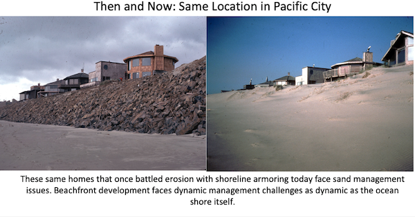 Climate change is already exacerbating these challenges along our coastline. At the south end of Pacific City, you can see in the below photo a stark example of how shifting El Nino patterns, prevailing winds and increased storm activity can further these extreme coastal management challenges. The photo at left is from the late 70s and the photo at right is a few years later in the early 80s. One year's increased storm activity can lead to shoreline armoring with rip rap to protect homes from the ocean, while the next year those same homes might be bulldozing sand off the house. The narrow margin of our public beaches will continue to get squeezed from both directions and these private and public property rights will be continually challenged.