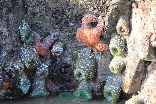 A stunning array of seastars and anemones adorn a low tide rocky wall