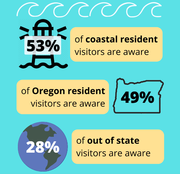This graph shows general awareness across all visitors whether they live in Oregon or not - Oregonians demonstrated higher awareness, nearly 50% aware while Oregon coastal residents were nearly 60% aware