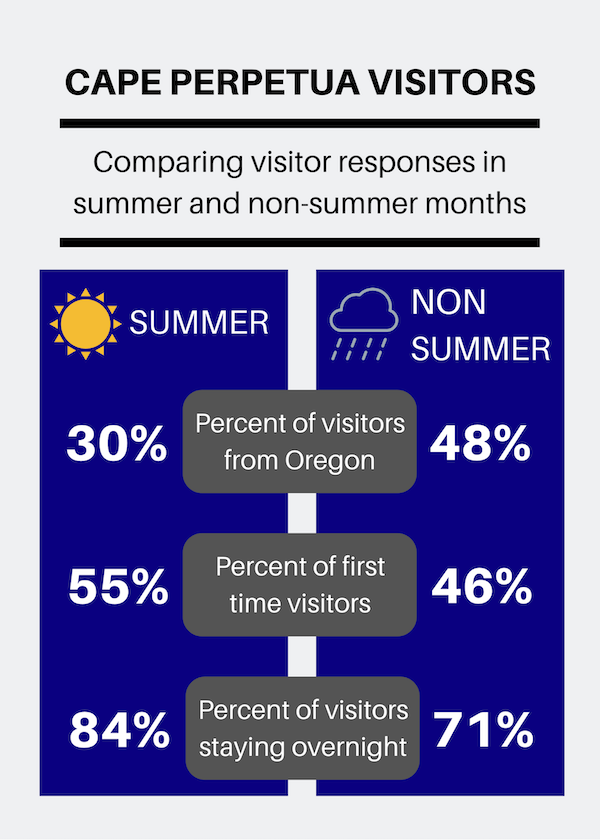 Understanding Cape Perpetua visitors is useful for local community organizations serving these visitors - beyond just whether or not we're doing effective outreach, we were able to uncover a lot of other valuable information important to businesses, adjacent towns and natural resource agencies that manage these important areas. The main objectives of this survey were to better understand Cape Perpetua visitors’ marine reserve awareness and knowledge, demographics and characteristics, and tourism decisions and opinions. Through this two-year intercept survey of Cape Perpetua visitors, we were able to capture the first comprehensive understanding of Cape Perpetua visitors’ marine reserve awareness, demographics, trip characteristics and opinions.