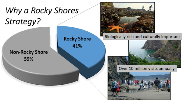 Oregon's rocky shoreline is a defining feature of our coast providing not only spectacular vistas and scenic opportunities, but also providing ecologically significant habitat for a broad diversity of plants and animals. About 41% of Oregon's land and sea boundary is comprised of tidepools, cliffs, rocks and submerged reefs supporting an ecologically rich and diverse environment and attracting millions of visitors each year.