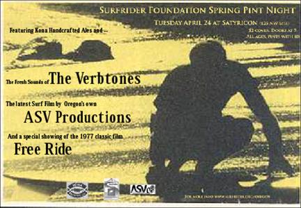 Come drink some Cold Beer for Clean Water! Join us at Satyricon (125 NW 6th) at 7pm on Tues, April 24th. Entertainment includes Oregon surf films by ASV Productions and a performance by the amazing surf band - the Verbtones. Portland Chapter is proud to have Kona Brewing as a sponsor, and patrons will recieve a free pint glass with Kona and Surfrider logo with each beer purchase. All proceeds support Blue Water Task Force - Surfrider's volunteer water quality testing program. There will also be info on Surfrider campaigns and volunteer opportunities. $2 cover. Doors open at 7pm. This is an all-ages show, pints with valid ID only. For more info on Verbtones www.theverbtones.iwarp.com For more info on ASV Productions: www.awesomesurfvideos.com See you there!