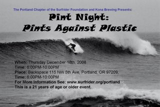 Mark your calendars: Thursday December 18th! The Portland chapter will be raising libations and funding for their Ban the Bag Campaign. Come out to the Backspace from 6:00 pm-10:00pm (115 NW 5th Ave.) and enjoy some cool beverages from Kona Brewing, score a wicked pint glass with your beverage purchase and support our clean oceans, waves and beaches. Contact garyjocelyn@gmail.com for more information or just show up on the 18th. Backspace: 115 NW 5th Ave. Portland.