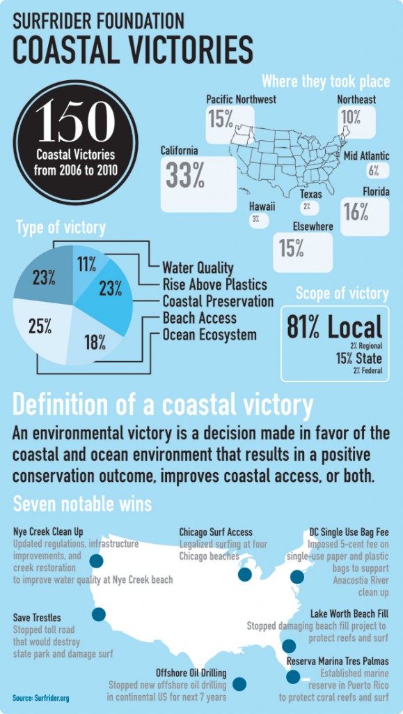 The Surfrider Foundation originally set the 150-victory goal as a way to measure success on the ground. Surfrider Foundation defines a coastal victory as an official decision made in favor of the coastal and ocean environment that results in a positive conservation outcome, improves coastal access, or both.