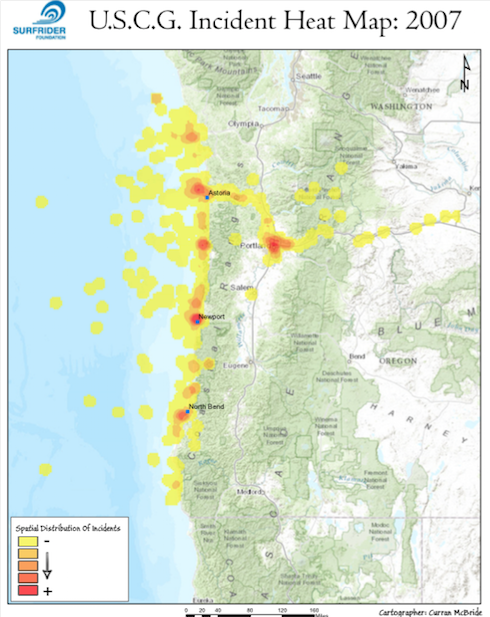 Surfrider Foundation volunteer Curran McBride heard the need for that local analysis. Two weeks following the FOIA request for the data, Curran got to work developing the maps which provide yearly thematic representation of the amount of incidents that the U.S.C.G. responded to for the 3 stations in Oregon: Astoria, Newport and North Bend. McBride then analyzed the data associated with those incidents for each year to give the user a deeper understanding of the nature of the responses, such as statistics on lives saved or people in the water.