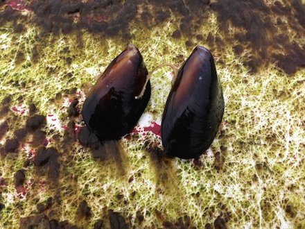 Mytilus galloprovincialis - a non-native species of mussel collected from the vessel that is a problematic invasive in our neighboring coastal states and around the pacific.