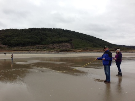 It was serendipitous that the Siuslaw Chapter of Surfrider Foundation decided to switch their marine debris monitoring site this morning to Muriel Ponsler State Park, a location just a couple of miles north of where the team had previously identified to initiate their monitoring program. Upon arrival, the monitoring team, consisting of Siuslaw Chapter volunteers Lisa Wallace, Al Costa, Jon Tipple and Amber Tucker headed north on the remote beach only to discover a 22ft derelict Japanese vessel right at the low tide line, partially submerged in the surf.