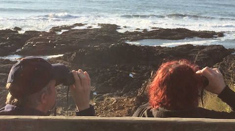 A couple peers through binoculars at seals resting shoreside at Strawberry Hill A couple peers through binoculars at seals resting shoreside at Strawberry Hill