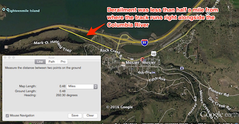 Last week's derailment could have been worse in so many ways. A snapshot from Google Earth shows that had the train derailed less than half a mile further down the track, it would have likely sent rail cars directly into the Columbia River, right during spring Chinook season.  Moiser is located upstream of the Bonneville Dam where, according to a recently released report from the Washington Attorney Generals Office, is the worst place for a train derailment and spill because any oil that reaches the dam would be mixed by the turbines making remediation efforts much more challenging and costly. While some oil has indeed hit the Columbia, reports so far suggest that it is a relatively small amount. We may not be so "lucky" next time.