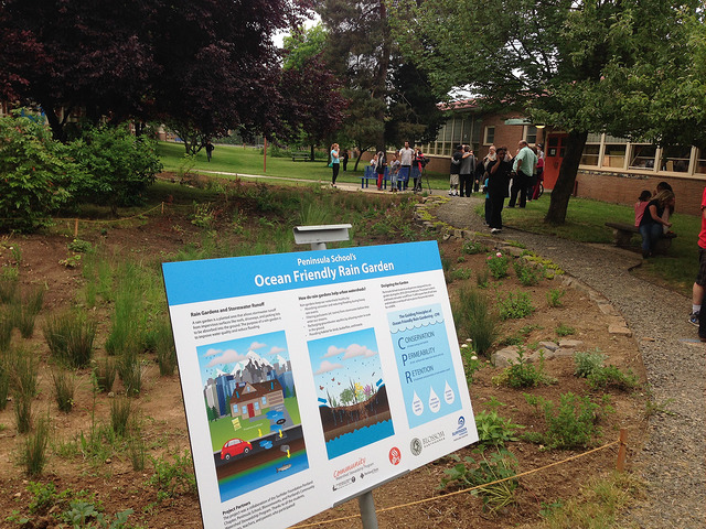 Ocean Friendly Gardens, such as this one at a PDX school, helps prevent polluted runoff and improves water quality, potentially reducing the impacts of OAH